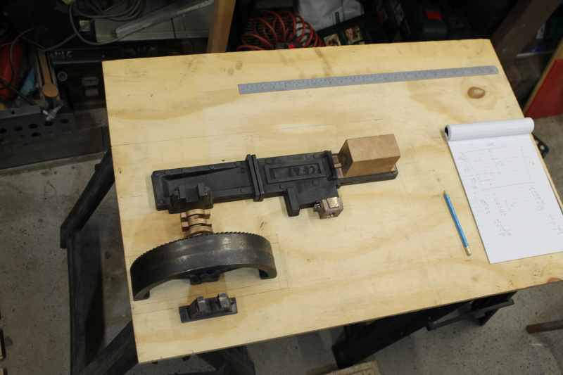 The castings laid out on the baseboard, just to get an idea of size. ( the ruler is 2 ft ).