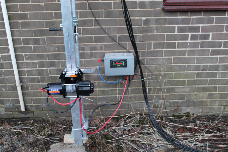 I ordered an aluminium telescopic mast 6 metres high in the low position and 11.5 meters when raised and topped it off with a 3 element 6 metre beam, a 5 element 2 metre beam and a 10 element 70 cms beam and mounted the collinear on top.